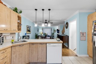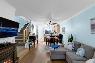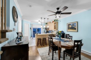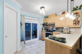 Cuisine chaleureuse et fonctionnelle pensée pour le quotidien Nombreuses armoires en bois clair offrant un généreux rangement Comptoirs neutres avec vaste surface de préparation Disposition en L maximisant l'efficacité Portes-patio coulissantes inondant l'espace de lumière Accès direct au balcon privé, parfait pour le café du matin ou les BBQ d'été Salle d'eau pratique au rez-de-chaussée