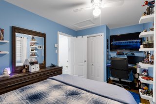 Chambre principale offrant un véritable espace de détente avec deux garde-robes Deuxième chambre idéale comme bureau ou chambre additionnelle Planchers laminés foncés dans les deux chambres