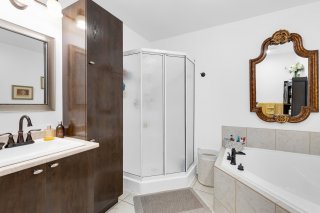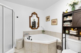 Salle de bain principale spacieuse et bien aménagée Grand bain profond et douche indépendante vitrée Vanité et robinetterie modernes Parfait équilibre entre confort et fonctionnalité